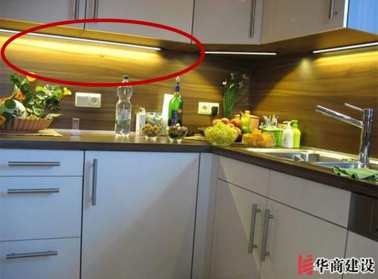 22、廚房不要只裝吸頂燈,晚上做飯身體會(huì)擋住光源,最好在吊柜下面裝一個(gè)觸碰光源,增加照明。