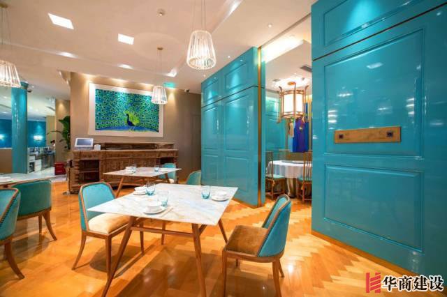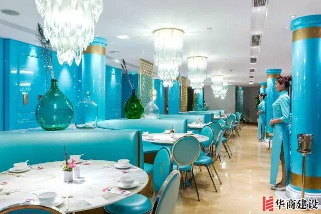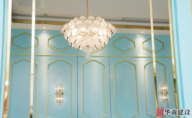 店內主色調采用獨特的“孔雀藍”,同樣以金色搭配,透露出奢華感