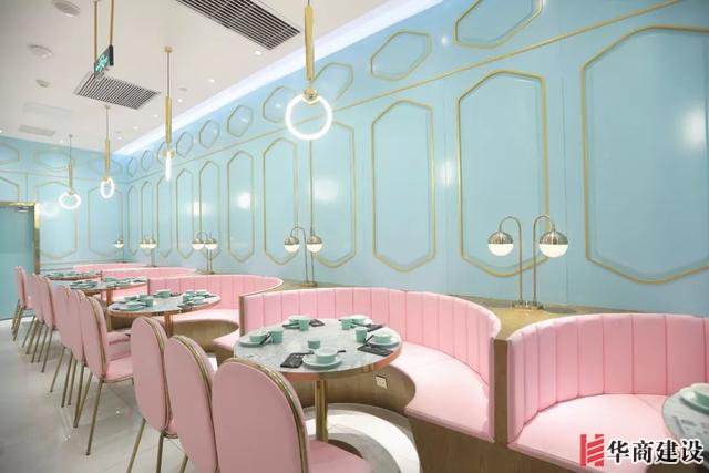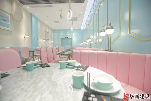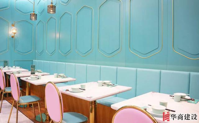 店內并不是清一色的藍色,用粉色桌椅點綴大面積藍色。