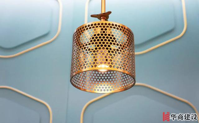天花板上金色的金屬吊燈和墻壁上的金色壁燈,細節(jié)處散發(fā)著精致感。