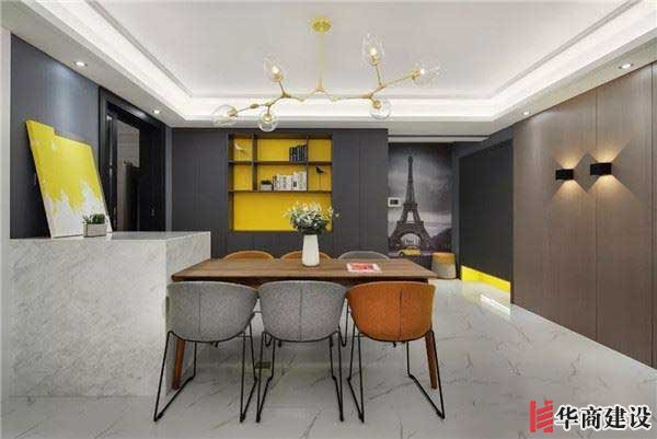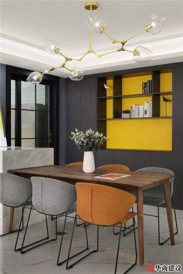 入戶即見餐廳,餐桌與島臺相連,后方系統(tǒng)柜作背景,亮黃色與深色柜體凸顯層次與跳躍感。