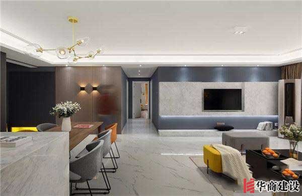 客廳地面通鋪淺色仿大理石紋路瓷磚,與極簡無主燈吊頂,構成寬敞大氣的公領域空間。