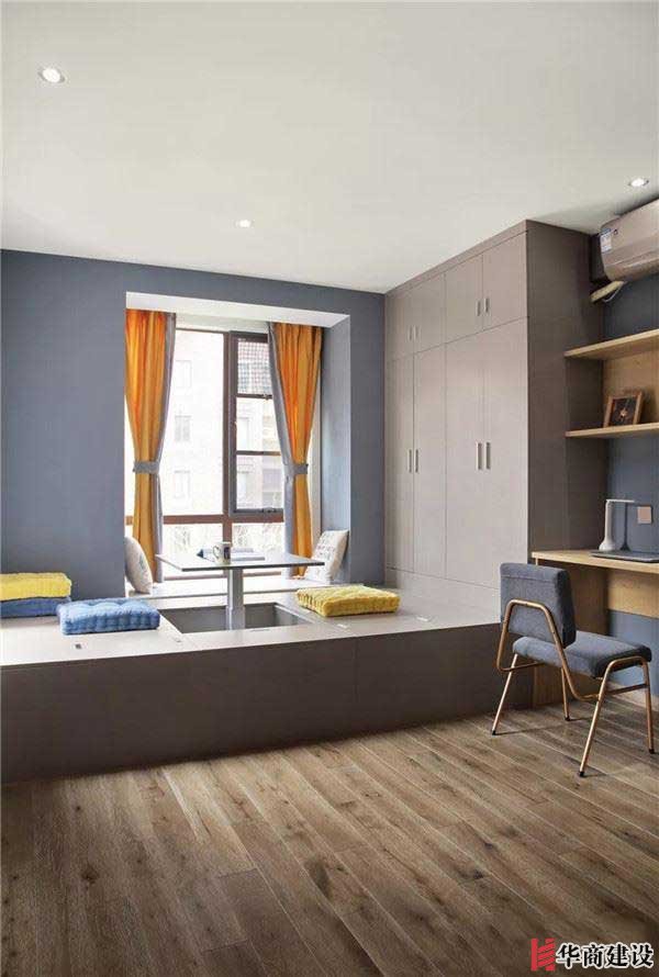多功能房,木色地面與簡潔無主燈頂面,木作榻榻米連接置頂儲物柜,升降桌與書桌的加入增添機能。